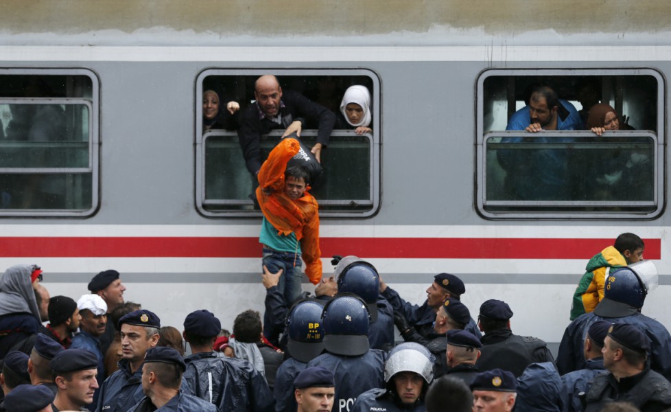 Η φωτογραφία τραβήχτηκε σήμερα από τον σιδηροδρομικό σταθμό Tovarnik, της Κροατίας, όπου μετανάστης τραβά ένα αγόρι από το παράθυρο του βαγονιού μπροστά στα μάτια αστυνομικών.