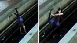 Στο βίντεο, η γυναίκα φαίνεται να βγάζει το παλτό και το κασκόλ της πριν πηδήξει από την αποβάθρα του σταθμού του μετρό της Ουάσιγκτον στις ράγες.