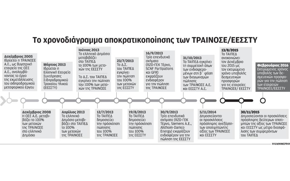 Το ΤΑΙΠΕΔ φέρεται να έχει θέσει ως όριο την υπογραφή των σχετικών συμβάσεων μέχρι την ερχόμενη Παρασκευή 15 Ιανουαρίου, έτσι ώστε αυτές να διατεθούν στους ενδιαφερόμενους επενδυτές προκειμένου να γίνει η υποβολή των δεσμευτικών προσφορών για την πώληση του 100% των μετοχών των εταιρειών ΤΡΑΙΝΟΣΕ/ΕΕΣΣΤΥ μέσα στον Φεβρουάριο.