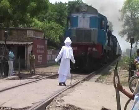 Ο τρένο πλησιάζει όλο και περισσότερο και όσο πλησιάζει, τόσο σφυρίζει επίμονα. Αλλά ο άνδρας δεν φεύγει παρά μόνο τη στιγμή που η αμαξοστοιχία έχει φτάσει λίγα μέτρα από εκείνον. Κάνει ένα άλμα, πηδά στο πλάι και ξεσπά σε γέλια...