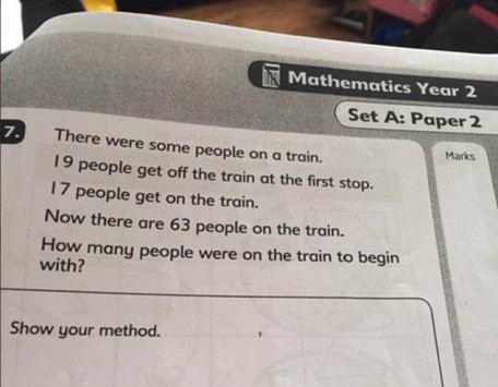 Το τεστ που κάνει θραύση στο ίντερνετ απευθύνεται σε μαθητές της Β' δημοτικού. Η ερώτηση έχει ως εξής: "Υπήρχαν κάποιοι άνθρωποι σε ένα τρένο. 19 κατεβαίνουν στην πρώτη στάση και μπαίνουν 17. Τώρα υπάρχουν 63 άνθρωποι στο τρένο. Πόσο άνθρωποι υπήρχαν στο τρένο;".