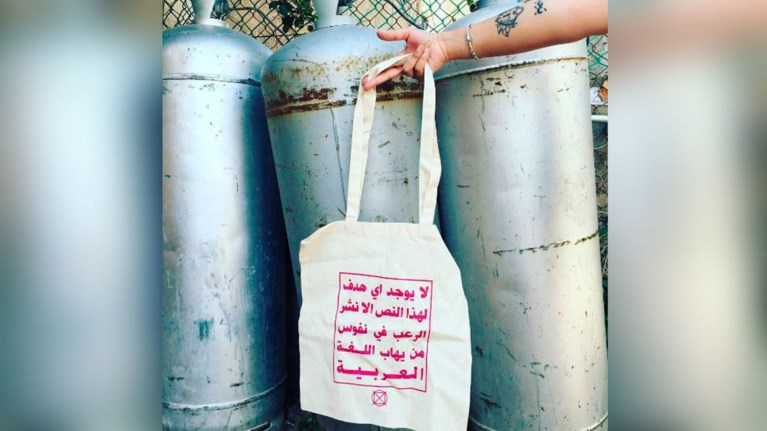 Το μήνυμα πάνω στην τσάντα γράφει: «Αυτό το κείμενο δεν έχει κανέναν άλλο σκοπό παρά να τρομοκρατήσει όλους αυτούς που φοβούνται την αραβική γλώσσα».