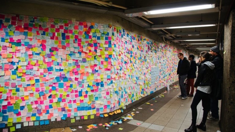 Στον απόηχο των προεδρικών εκλογών του 2016, η Νέα Υόρκη κέρδισε ένα οδυνηρό έργο τέχνης στο δημόσιο χώρο. Χιλιάδες post-it κολλημένα στον τοίχο του μετρό στην Union Square. Τίτλος του πρωτότυπου αυτού έργου: Metro-Therapy. Πρόκειται για την ιδέα του καλλιτέχνη Μάθιου Λεβί τσάβες που προσκάλεσε τον κόσμο που μετακινείται με αυτή τη γραμμή να γράψει μετεκλογικά τα συναισθήματά του στον τοίχο. Ένα μήνα αργότερα το έργο έχει εξαπλωθεί παντού μέσα στο σταθμό, σε όλες του τις αίθουσες μεταφέροντας μηνύματα, ελπίδας θυμού, αλληλεγγύης.
