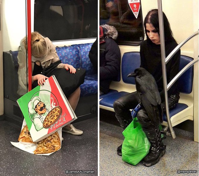 Η νεαρή γυναίκα ντυμένη από την κορυφή μέχρι τα νύχια με μαύρα ρούχα, κρατά ανάμεσα στα πόδια της μία τσάντα με ψώνια, όπως πολλοί άλλωστε στο μετρό, με το κοράκι να κάθεται ήσυχα στον αριστερό της μηρό.