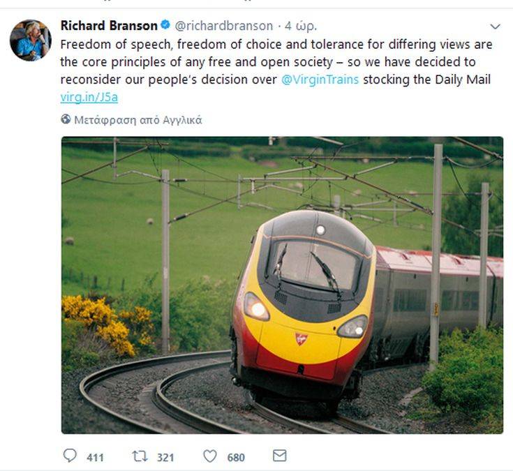 Ο βρετανός δισεκατομμυριούχος Ρίτσαρντ Μπράνσον ανακοίνωσε σήμερα ότι θα πωλείται και πάλι στα τρένα της εταιρείας του Virgin η εφημερίδα Daily Mail, η απαγόρευση της πώλησης της οποίας εξαιτίας της στάσης της υπέρ του Brexit είχε προκαλέσει αντιδράσεις.