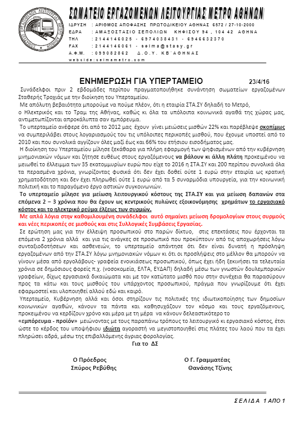 Σύμφωνα με επιστολή του συνδικάτου προς τους εργαζόμενους της ΣΤΑΣΥ, ύστερα από συνάντηση με τη διοίκηση του υπερταμείου τον περασμένο μήνα, το υπερταμείο θα έχει ως στόχο για τα επόμενα 2-3 χρόνια τη μείωση του λειτουργικού κόστους και των δαπανών της εταιρείας. Κεντρικοί πυλώνες εξοικονόμισης κόστους, σύμφωνα με την επιστολή του συνδικάτου, θα αποτελέσει η μείωση του εργασιακού κόστους και το ηλεκτρικό ρεύμα έλξεως των συρμών.