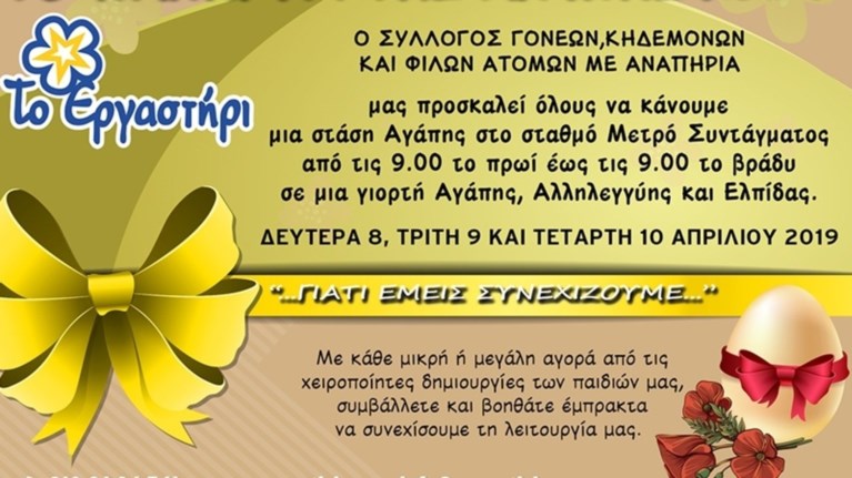 Ο Σύλλογος Γονέων Κηδεμόνων και Φίλων Α.με.Α. «Το Εργαστήρι» διοργανώνει και φέτος τη μεγάλη ανοιξιάτικη γιορτή «ΤΟ ΠΑΣΧΑΛΙΑΤΙΚΟ ΠΑΝΗΓΥΡΙ ΤΗΣ ΑΓΑΠΗΣ 2019» στην αίθουσα πολλαπλών χρήσεων του ΜΕΤΡΟ ΣΥΝΤΑΓΜΑΤΟΣ 8, 9 και 10 Απριλίου 2019 από τις 09:00 το πρωί έως τις 09:00 το βράδυ.