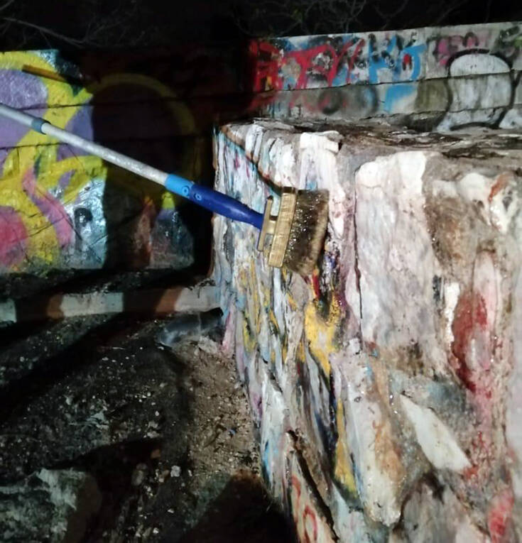 Ο τοίχος είχε βανδαλιστεί αισθητικά τα προηγούμενα χρόνια σχεδόν σε κάθε του σημείο με αποτέλεσμα η εργασία αποκατάστασης να είναι εξαιρετικά δύσκολη σε συνδυασμό με το γεγονός ότι οι άνθρωποι που εργάζονται -για λόγους απόλυτης ασφάλειας- έχουν στην διάθεση τους μόνο λίγες ώρες κάθε νύχτα, όταν σταματούν τα δρομολόγια των τρένων. Για να καθαριστεί ένα μεγάλο κομμάτι ως τώρα απαιτήθηκαν περισσότερα από 100 λίτρα ειδικού διαλυτικού και πολλοί τόνοι νερού σε διάστημα περίπου μιας εβδομάδας. Το επόμενο διάστημα, όπως μεταδίδει το Αθηναϊκό Πρακτορείο Ειδήσεων οι εργασίες -υπό την καθοδήγηση της Διεύθυνσης Καθαριότητας - Ανακύκλωσης- θα συνεχιστούν ώστε να καθαριστούν στην ίδια περιοχή συνολικά 200 μέτρα.