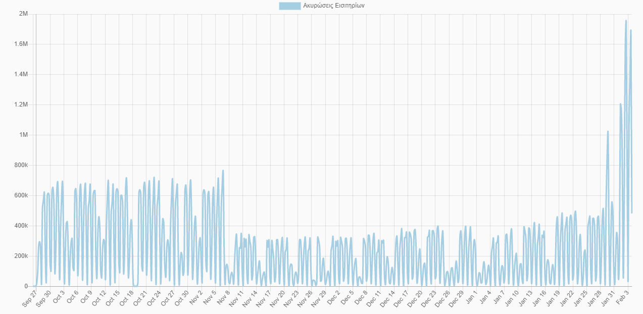 Συγκριτικά, την Παρασκευή 29 Ιανουαρίου είχαν επικυρωθεί 835.261 εισιτήρια, δηλαδή αυτή την εβδομάδα οι επιβάτες διπλασιάστηκαν!