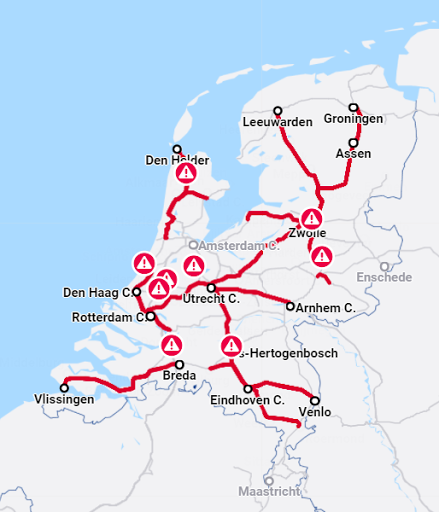 Ο χειριστής τρένου, Nederlandse Spoorwegen (NS), ανέστειλε τις υπεραστικές διαδρομές και τις τοπικές διαδρομές σε όλη την Ολλανδία, ζητώντας από τους ταξιδιώτες να αναβάλουν τα ταξίδια τους εάν είναι δυνατόν.