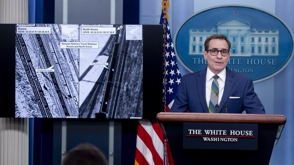 Ο εκπρόσωπος παρουσίασε μια δορυφορική φωτογραφία που τραβήχθηκε στις 18 Νοεμβρίου και δείχνει, όπως λέει ο Λευκός Οίκος, ένα ρωσικό τρένο να πηγαίνει στη Βόρεια Κορέα για να παραλάβει όπλα για τη Βάγκνερ. Στις 19 Νοεμβρίου η Βόρεια Κορέα γέμισε πέντε βαγόνια με εμπορευματοκιβώτια και το τρένο επέστρεψε στη Ρωσία. Σύμφωνα με τον Κίρμπι, η Βόρεια Κορέα παρέδωσε πυραύλους τους οποίους θα χρησιμοποιούσε η Βάγκνερ. "Μολονότι εκτιμούμε πως η ποσότητα του υλικού που παραδόθηκε στη Βάγκνερ δεν άλλαξε τη δυναμική του πεδίου της μάχης στην Ουκρανία, αναμένουμε ότι θα συνεχίσει να λαμβάνει βορειοκορεατικά οπλικά συστήματα", πρόσθεσε.