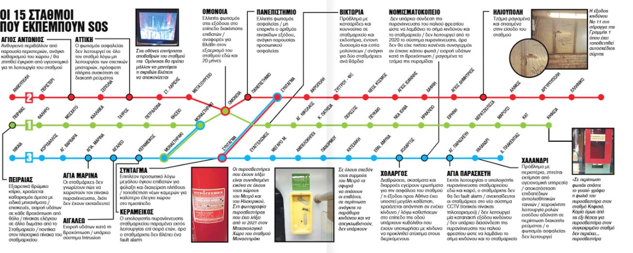 Αλλο ζήτημα που άπτεται της ασφάλειας είναι οι έξοδοι κινδύνου για τις οποίες σημειώνεται πως «χρήζουν συντήρησης, επιθεώρησης και άμεσης επισκευής». Για το φρεάτιο «3Η09 (Εθνική Αμυνα - Κατεχάκη)» διαπιστώθηκε έλλειψη εξόδου κινδύνου από τη σήραγγα ενώ για τις επίγειες εξόδους κινδύνου επί της τροχιάς στη Γραμμή 1, φωτογραφίες αποδεικνύουν ότι είναι κλειδωμένες με αλυσίδα και λουκέτο. Προβλήματα παρατηρούνται στη Γραμμή 1 και στην επιδομή με «βυθίσεις» και «στραβάδες», στα τηλέφωνα έκτακτης ανάγκης, εκ των οποίων λειτουργούν μόνο 2 με 3, αλλά και στους ανεμιστήρες απαγωγής καπνού πλησίον του σταθμού Βικτώρια οι οποίοι λειτουργούν μόνο με τοπικό χειρισμό, από αίθουσα δίπλα στο σταθμαρχείο, για τον οποίο δεν είναι κανείς εκπαιδευμένος. Ταυτόχρονα, η έκθεση αναφέρει ότι «οι ανεμιστήρες στο τμήμα Ομόνοια - Μοναστηράκι δεν συνδέθηκαν ποτέ στην παροχή ρεύματος», ότι «οι κάμερες ασφαλείας δεν έχουν συνδεθεί και όσες είναι σε λειτουργία δεν γνωρίζει κανείς πού πάει η εικόνα» και πως «ο κλιματισμός του σταθμού της Ομόνοιας λειτουργεί σε 24ωρη βάση χωρίς να υπάρχει διαδικασία για το ποιος τον χειρίζεται, πώς πρέπει να τον χειριστεί (κανονική ή ανάστροφη λειτουργία για απαγωγή) και πότε». Για το Κέντρο Ελέγχου Λειτουργίας της Γραμμής 1 αναφέρεται ότι μερικές οθόνες του μιμικού πίνακα χάλασαν και αντικαταστάθηκαν με οθόνες δέκτη τηλεόρασης ενώ υπάρχουν αισθητήρες και εξοπλισμός (ρολά σταθμών, κυλιόμενες κλίμακες κ.ά.) που δεν είναι συνδεδεμένα με το σύστημα.