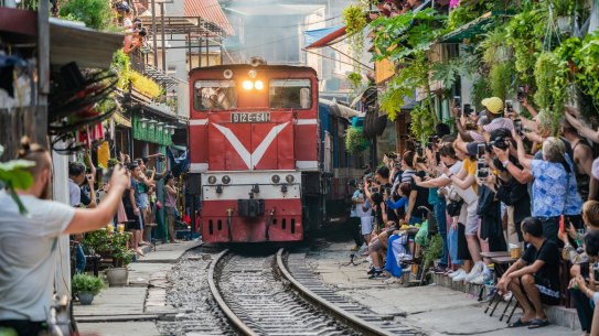 Το τρένο ταξιδεύει αργά μέσα από την αγορά. Όλα αυτά τα πρόσωπα κοιτούν ψηλά και χαμογελούν, με τους ανθρώπους να βγάζουν φωτογραφίες και να κουνάνε ανυπόμονα (α, έτσι είναι η φήμη). Από τη σκοπιά τους, είμαι μόνο ένα από τα πολλά πρόσωπα σε ένα γεμάτο τρένο, ένα μικρό μέρος αυτής της παράλογης εικόνας. Μεταξύ των ανθρώπων, έχω μια γεύση από πωλητές που πουλάνε φρούτα και λαχανικά, επιδόρπια, αναμνηστικά, κρέας, φρεσκοαλιευμένα ψάρια σε πλαστικές γλάστρες, street food, όπως το λες. Καθώς το τρένο κινείται, πετάει πάνω από αντικείμενα προς πώληση που περικλείουν τις γραμμές - μιλήστε για μια στενή συνάντηση.