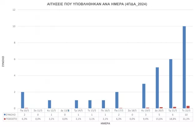 Στο πρώτο διάγραμμα των στατιστικών στοιχείων, που αποτυπώνονται οι αιτήσεις που υποβλήθηκαν ανά ημέρα, φαίνεται ότι οι περισσότερες αιτήσεις (10) για την προκήρυξη πραγματοποιήθηκαν την Τετάρτη 22 Μαΐου, ημέρα κατά την οποία παρατάθηκε για λίγες ώρες η προθεσμία υποβολής αιτήσεων, ενώ καμία αίτηση δεν υποβλήθηκε το Σάββατο 11 Μαΐου, τη Δευτέρα 13 Μαΐου και το Σάββατο 18 Μαΐου.