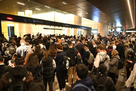 Σύγχυση στους μετακινούμενους: οι άνθρωποι προσπάθησαν να επιβιβαστούν σε τρένα παρόλο που λίγοι έφευγαν από τον κεντρικό σταθμό. Φωτογραφία: Elias Visontay/The Guardian