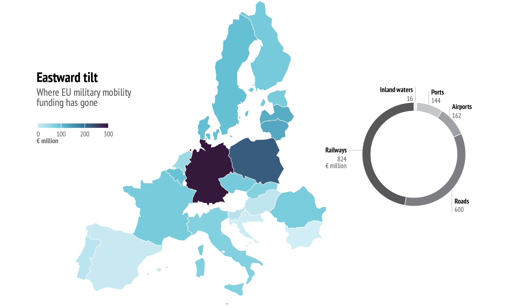 Από την πλευρά της, η ΕΕ συμμετέχει επίσης ολοένα και περισσότερο στη στρατιωτική κινητικότητα. Πρώτον, έχει χαρτογραφήσει την καταλληλότητα των υφιστάμενων υποδομών για τις στρατιωτικές ανάγκες και έχει προσδιορίσει τις προτεραιότητες για επενδύσεις. Η ΕΕ έχει επίσης χρηματοδοτήσει βελτιώσεις στις υποδομές, αντλώντας από έναν ειδικό προϋπολογισμό 1,7 δισεκατομμυρίων ευρώ από τη Διευκόλυνση «Συνδέοντας την Ευρώπη» για επενδύσεις σε υποδομές διπλής χρήσης . Αυτός ο προϋπολογισμός, ο οποίος καλύπτει την περίοδο έως το 2027, έχει χρησιμοποιηθεί για τη συγχρηματοδότηση 95 έργων διπλής χρήσης σε 21 κράτη μέλη. Παράλληλα, το Ευρωπαϊκό Ταμείο Άμυνας (ΕΤΑ) χρηματοδοτεί διάφορα έργα στρατιωτικής κινητικότητας. Αυτά περιλαμβάνουν την ανάπτυξη ενός συστήματος που θα επιτρέπει την ασφαλή ανταλλαγή πληροφοριών σχετικά με τις στρατιωτικές μετακινήσεις, έργα για μεσαίες και υπερμεγέθεις αεροπορικές μεταφορές και τη χρήση τεχνολογιών τρισδιάστατης εκτύπωσης για την ενίσχυση της ανθεκτικότητας της αλυσίδας εφοδιασμού .