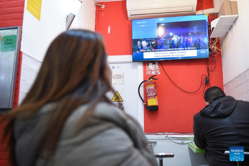 Άνθρωποι παρακολουθούν τηλεοπτικό ρεπορτάζ για τον εκτροχιασμό τρένου υψηλής ταχύτητας, σε ένα εστιατόριο στη Μαδρίτη της Ισπανίας, στις 19 Ιανουαρίου 2026.