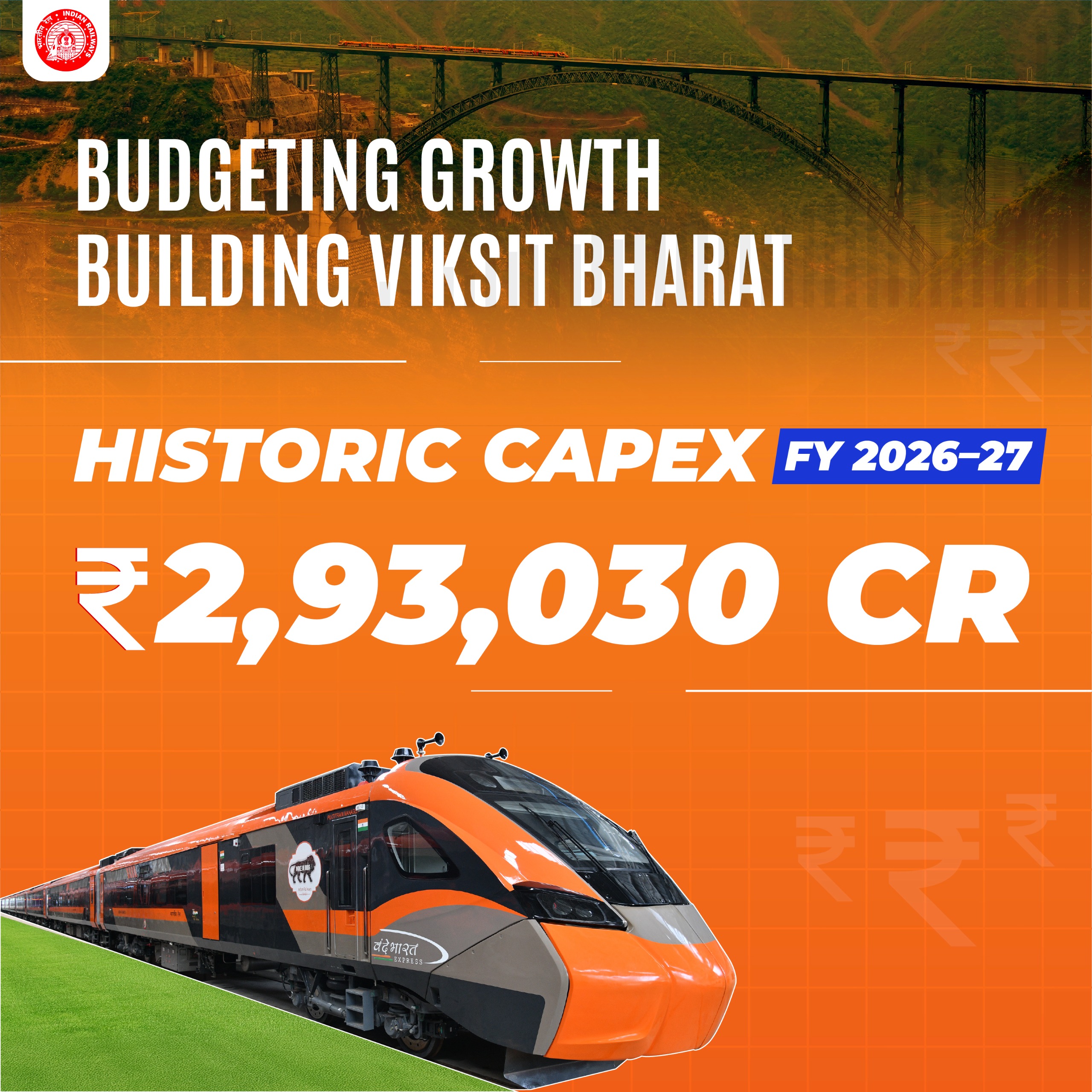 Οι Ινδικοί Σιδηρόδρομοι θα λάβουν κεφαλαιουχικές δαπάνες ρεκόρ ύψους 293.030 εκατομμυρίων ινδικών ρουπιών (35,3 δισεκατομμυρίων δολαρίων ΗΠΑ) στον προϋπολογισμό της Ένωσης για την περίοδο 2026-27, με επίκεντρο τις σιδηροδρομικές μεταφορές υψηλής ταχύτητας, την αποδοτικότητα των εμπορευματικών μεταφορών και την ασφάλεια των επιβατών.