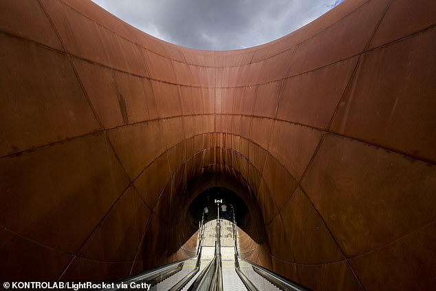 Η εκπληκτική είσοδος είναι κατασκευασμένη από φθαρμένο χάλυβα, που διογκώνεται από το έδαφος σε ένα τεράστιο οβάλ σχήμα που μοιάζει με πύλη προς τον κάτω κόσμο.